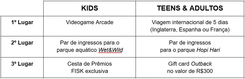 - Entrega de prêmios físicos: Os prêmios físicos (Videogame Arcade, Cesta de Prêmios FISK exclusiva e Gift Card Outback) serão entregues no dia da final, diretamente aos ganhadores, após a divulgação dos resultados.