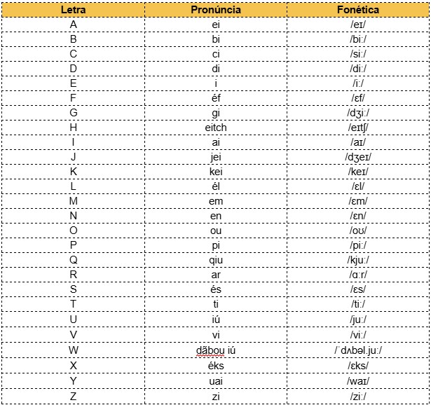 - Os alunos devem dominar a pronúncia correta das letras do alfabeto da língua inglesa;